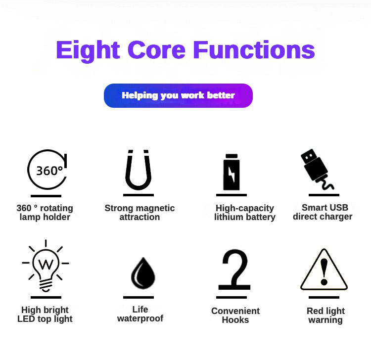 - Brightness adjustment: The product supports seven levels of brightness adjustment, including XPE strong light, medium light and flashing mode, and COB strong light, medium light, red light constant and red light flashing mode, to meet the lighting needs in different environments.